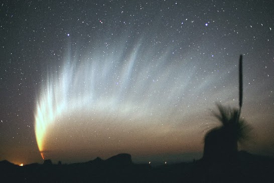 "Comet McNaught, the Great Comet of 2007, grew a spectacularly long and filamentary tail. The magnificent tail spread across the sky and was visible for several days to Southern Hemisphere observers just after sunset. The amazing tail showed its greatest extent on long-duration, wide-angle camera exposures. During some times, just the tail itself estimated to attain a peak brightness of magnitude -5 (minus five), was caught by the comet's discoverer in the above image just after sunset in January 2007 from Siding Spring Observatory in Australia. Comet McNaught, the brightest comet in decades, then faded as it moved further into southern skies and away from the Sun and Earth. Within the next two weeks of 2013, rapidly brightening Comet ISON might sprout a tail that rivals even Comet McNaught." (retirado do sítio www.nasa.gov)